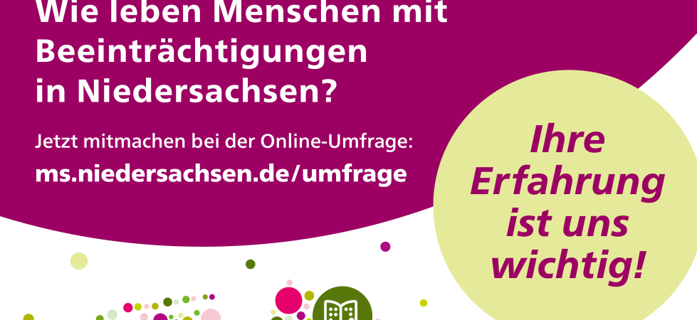 Wie leben Menschen mit Beeinträchtigungen in Niedersachsen? Landesweite Online-Umfrage gestartet! Um die Teilhabe von Menschen mit Beeinträchtigungen gezielt weiter zu verbessern, wurde eine landesweite Online-Umfrage im Auftrag des Niedersächsischen Ministeriums für Soziales, Arbeit, Gesundheit und Gleichstellung gestartet. Ziel der Umfrage ist eine Analyse zur Lebenssituation von Menschen mit Beeinträchtigungen als zentraler Baustein einer umfassenden Teilhabeanalyse. Sozialminister Dr. Andreas Philippi ruft...